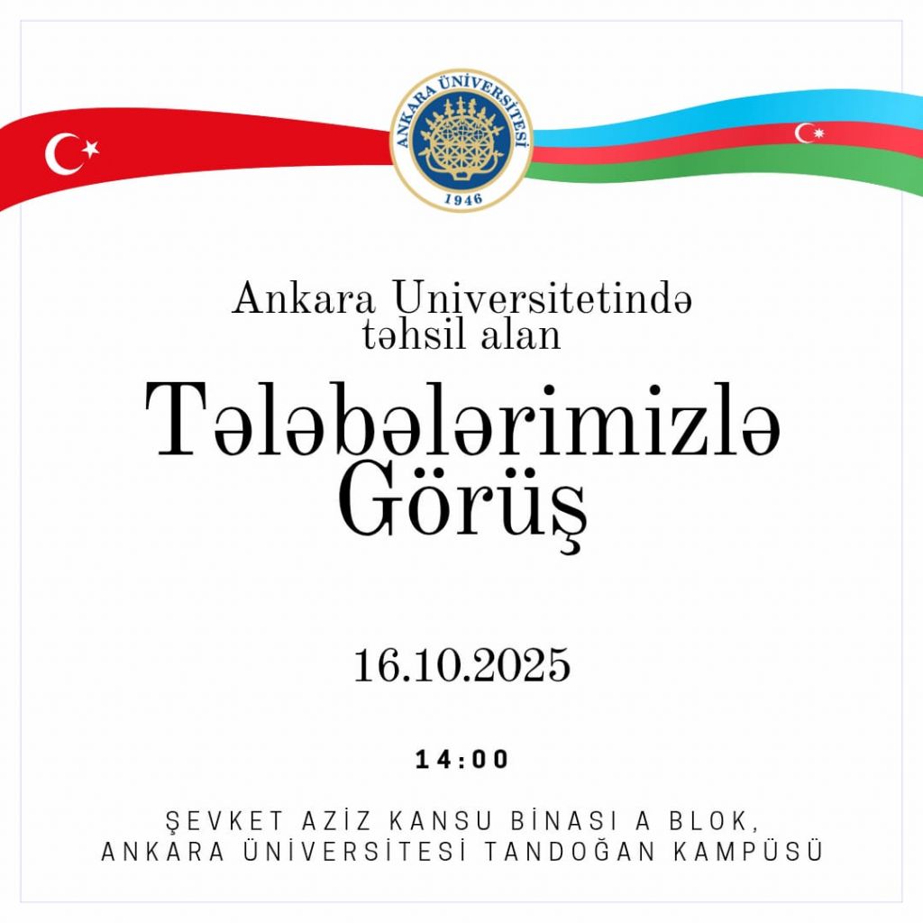 16 oktyabr 2025-ci il tarixində saat 14.00-da Azərbaycan Respublikasının Türkiyə Respublikasındakı Səfirliyinin təhsil məsələləri üzrə müşavirinin köməkçisi Tural Qafarlı Ankara Universitetinin Tandoğan Kampusunda yerləşən Aziz Şevket Kansu binasının konfrans salonunda sözügedən universitetdə təhsil alan azərbaycanlı tələbələrlə görüşəcək. Görüşdə məqsəd Tələbələrimizlə yaxından tanış olmaq, onların təhsil və yaşayışla bağlı problemlərini öyrənmək və problemlərin həllinə köməklik göstərməkdir. Görüşdə Öğrenci Dekanlığı və Uluslararası Öğrenci Koordinatorluğunun əməkdaşları da iştirak edəcəklər.
